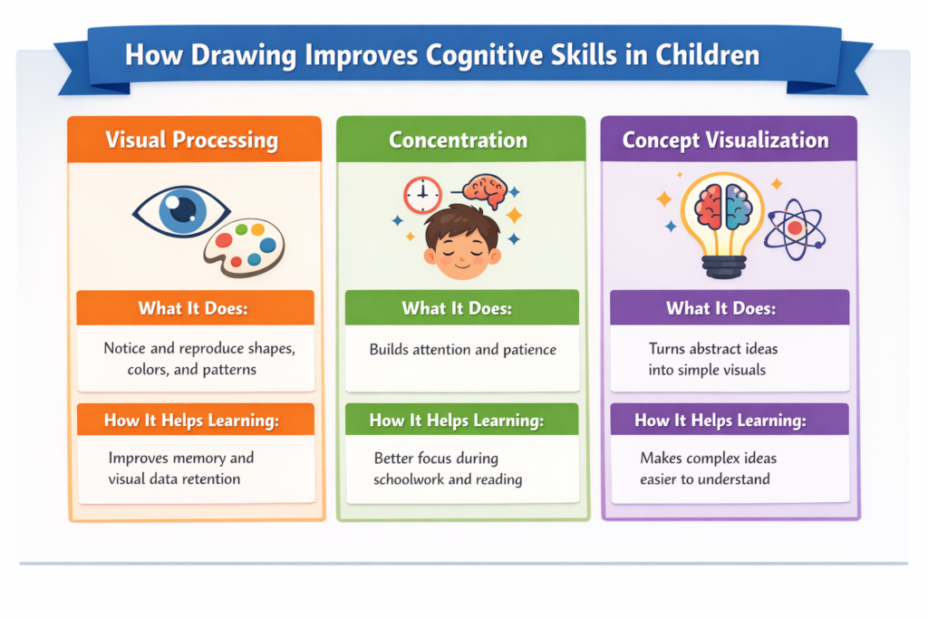 Drawing enhances visual processing skills by encouraging children to observe and replicate shapes, colors, and patterns. This activity strengthens their ability to process visual information and improves memory retention. When children draw, they are not just creating art; they are also exercising their brain’s ability to recall and reproduce what they have seen.